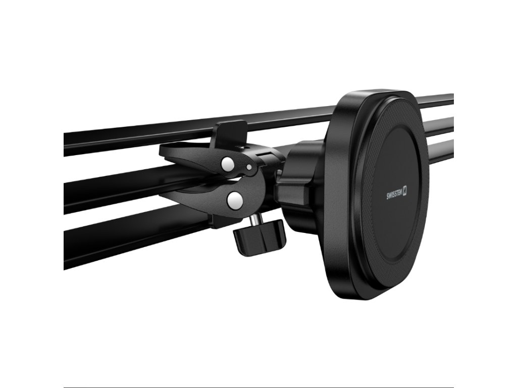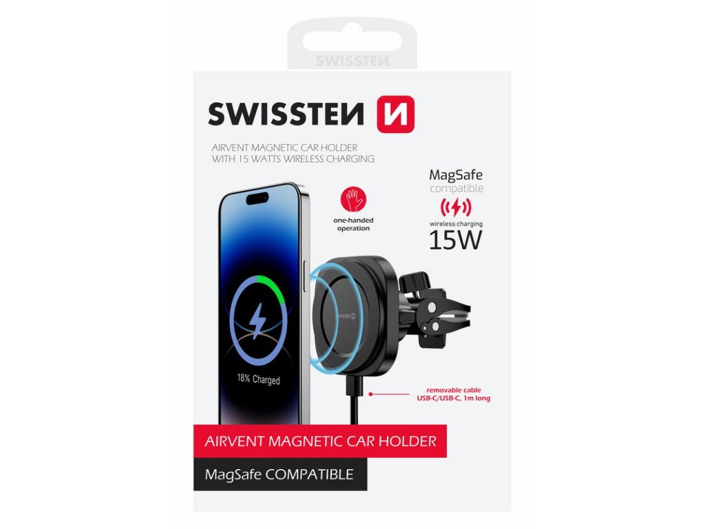 Magnetický držák Swissten do větrací mřížky s bezdrátovým dobíjením kompatibilním s MagSafe, vysokým výkonem 15W a odpojitelným kabelem. Baleno v blistru SWISSTEN.