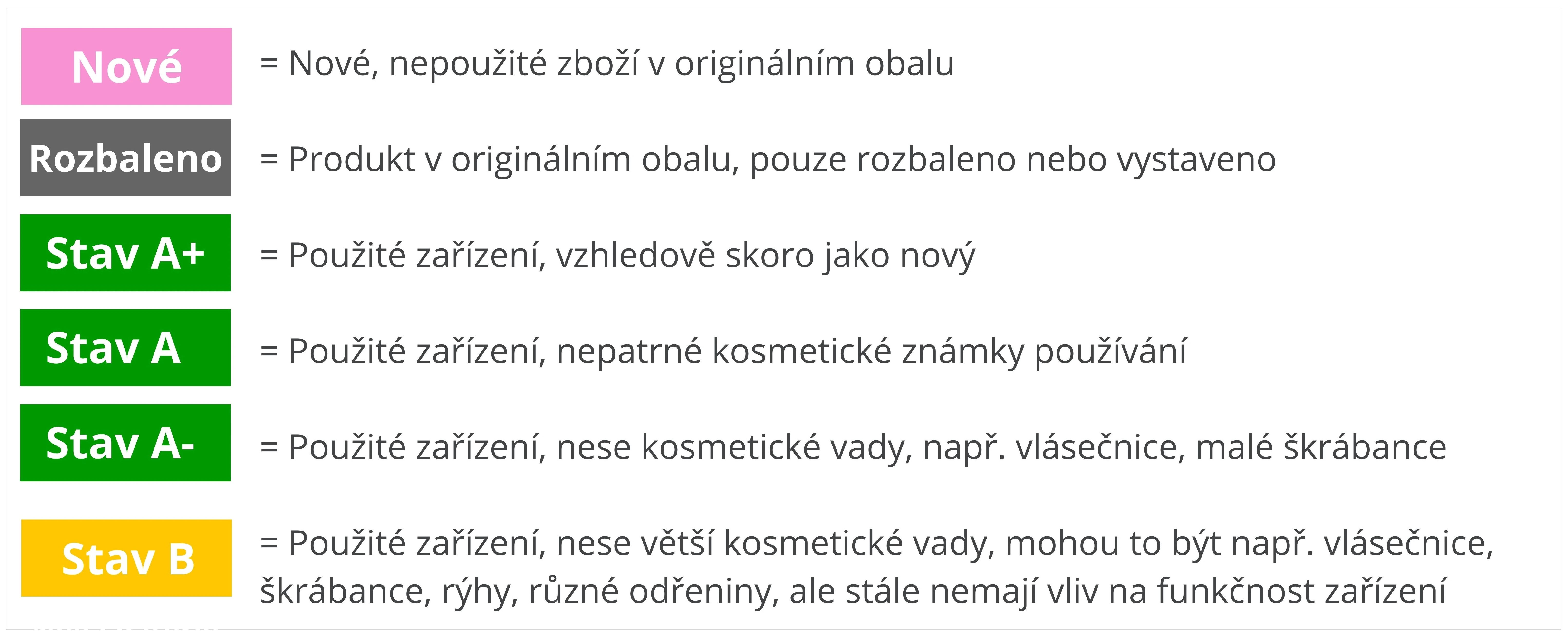 - Stavy od A+ do B jsou rozděleny pouze dle kosmetického vzhledu, stavy nemají vliv na funkčnost, všechna zařízení jsou plně funkční.