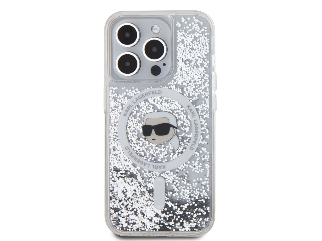 Karl Lagerfeld Liquid Glitter Karl Head MagSafe Zadní Kryt pro iPhone 15 Pro Transparent