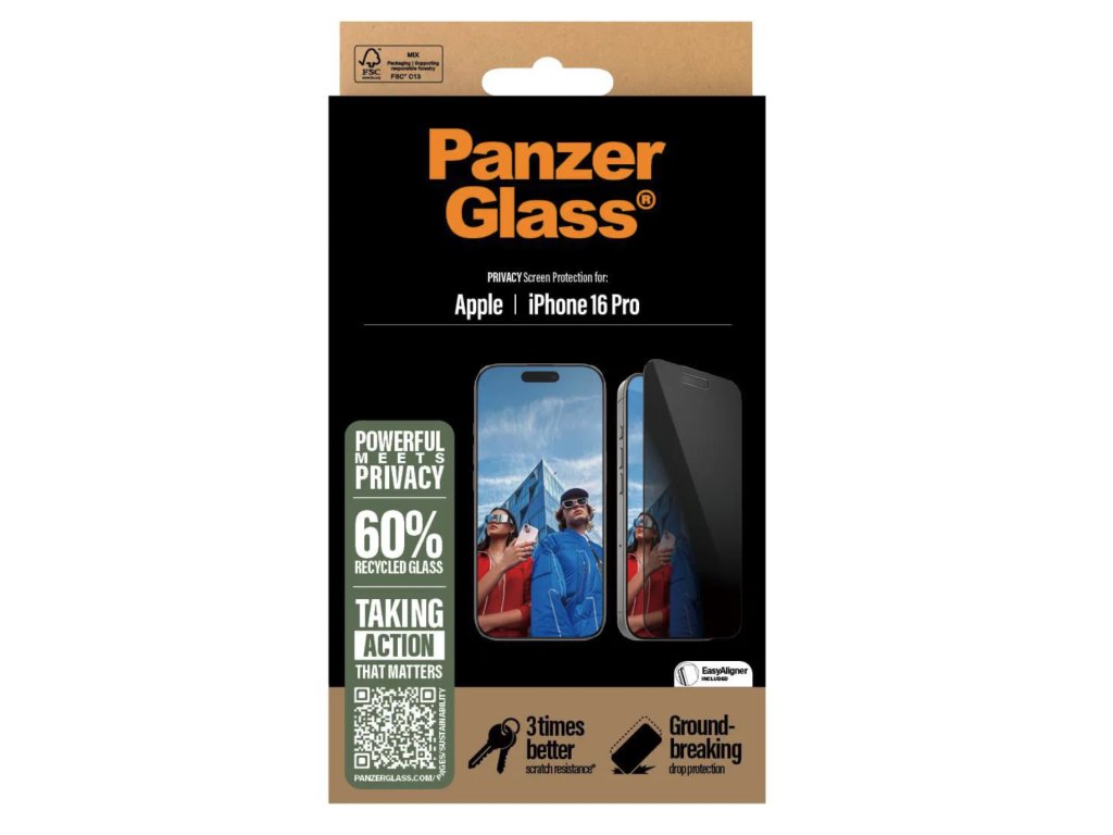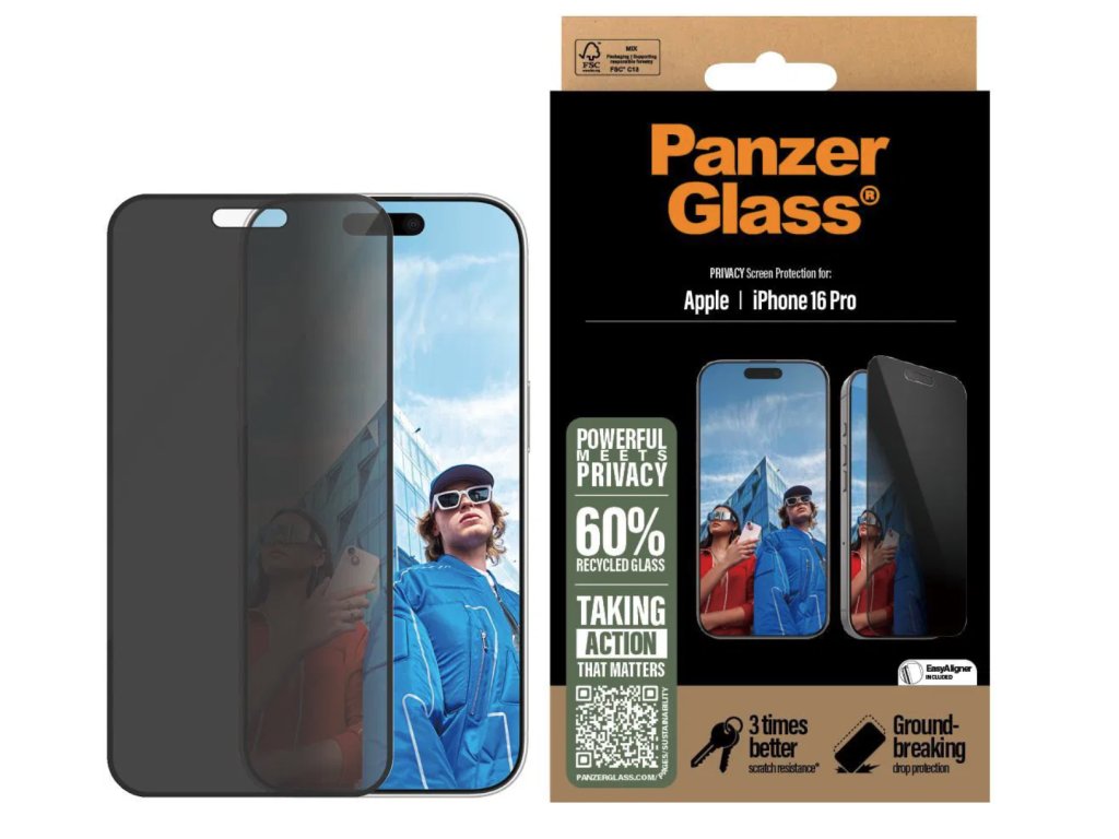 S touto ochranou obrazovky PanzerGlass® Privacy na ochranu soukromí vyrobenou ze 60 % z recyklovaného skla jsou vaše osobní údaje v bezpečí před zvědavými pohledy lidí sedících vedle vás ve vlaku, v kavárně nebo v kanceláři.